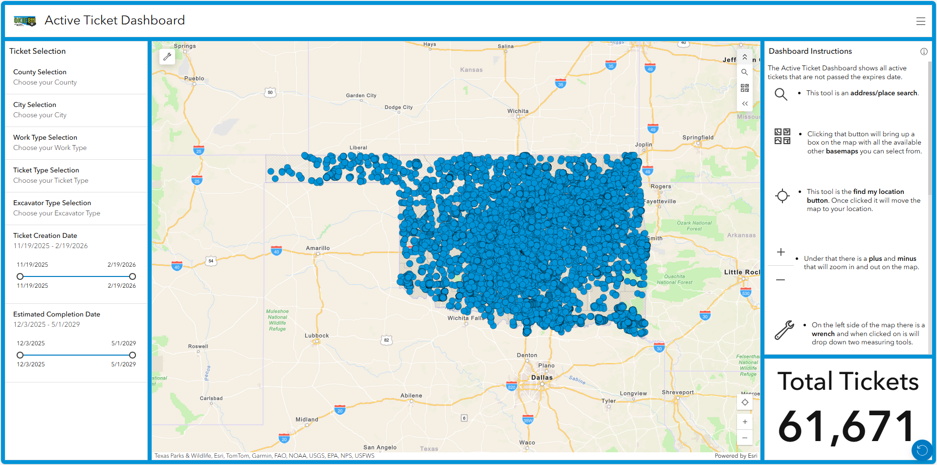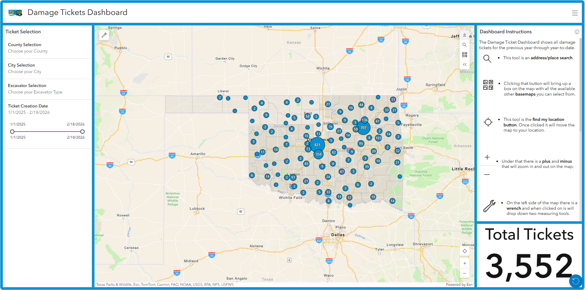 Disclaimer: The OKIE811 Tickets Public Dashboards are for informational purposes only and do not represent the full scope of Excavation or Damages in Oklahoma. Dots on the maps only represent the approximate location of a site and are not deemed sufficient for notice requirements and/or do not convey the full scope of a notification area. Only notices submitted through OKIE811 are included.